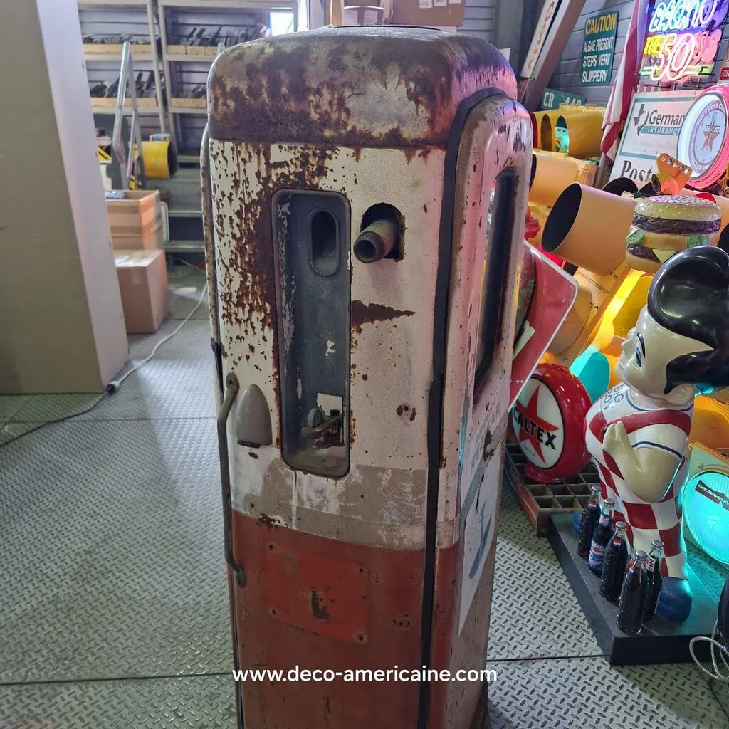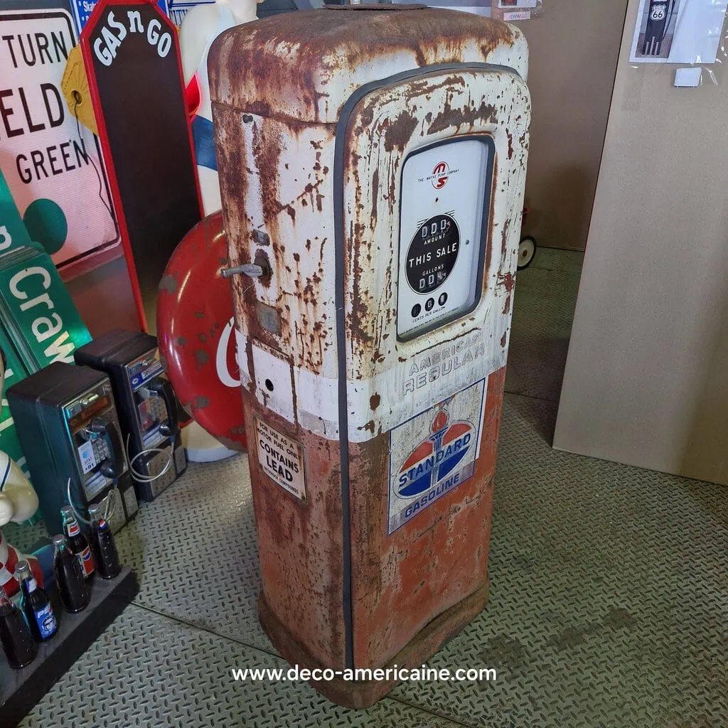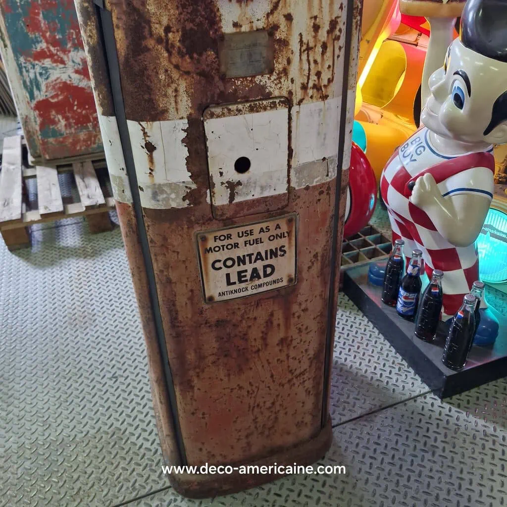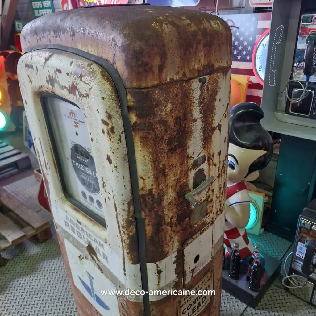 Pompe à essence authentique et vintage. C’est un objet de brocante américaine vendu As Is (en l’état) pour une décoration américaine à l’esprit Americana. Elle mesure 170 cm.