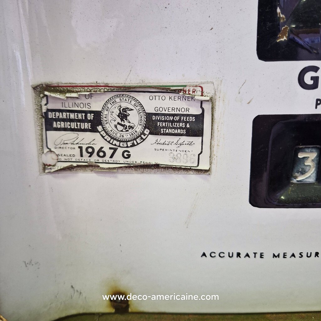 Cette pompe à essence a été chinée lors de mon voyage aux USA en janvier 2026. Elle est dotée d’une superbe patine et s’intégrera à une décoration américaine vintage dans votre maison, votre garage, votre bureau, etc. Elle est équipée de son pistolet d’origine.